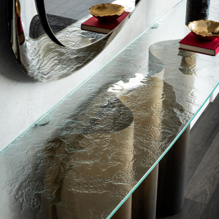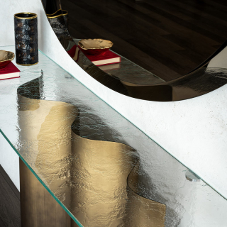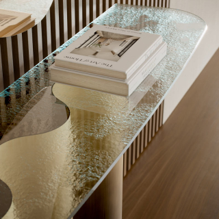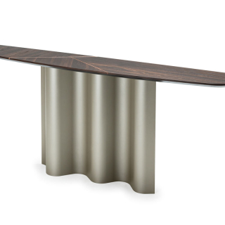 Консоль Nettuno - это плавные формы и изгибы. Металлическое основание напоминает морские волны и в зависимости от ракурса оно обыгрывается игрой света и тени. Основание доступно в четырех цветовых вариантах: Бронза, Титаниум, Оксид Латунь, Серый Оксид. Столешница может быть выполнена в прозрачном стекле, декоративном стекле, а так же в дереве Орех Каналетто или Жженый Дуб. Деревянная версия имеет изысканное сочетание сбалансированных стыков. Для заказа представлены различные размерные варианты. Так же данная консоль имеет два размера по высоте: стандартный 74 см и высокий вариант 92 см.