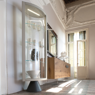 SABA - необычная витрина итальянского производства Cattelan Italia. Витрина имеет полукруглую и не симметричную с двух сторон поверхность. Модель оснащена стальным поворотным основанием. Рама корпуса может быть выполнена из дерева или иметь обивку из натуральной кожи. Витрина оснащена светодиодной подсветкой. Дизайн модели разработан: Aldo Greco. Страна производства: Италия.