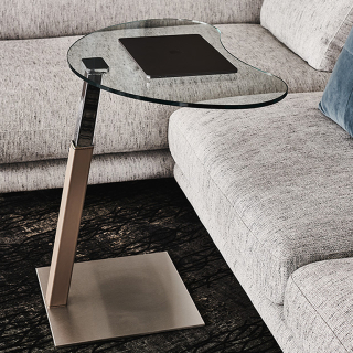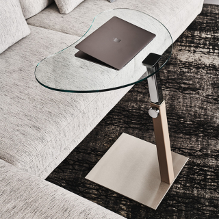 LAP - современный столик, который можно расположить у подлокотника дивана или кресла. Столик имеет возможность регулировки высоты, поэтому Вы сможете настроить столик LAP самым удобным образом. Квадратное основание столика выполнено из металла и по Вашему желанию может быть обтянуто натуральной кожей. Столешница изготавливается из стекла и доступна в двух вариантах формы: квадратной и сложной, мягкой формы со скруглёнными углами.