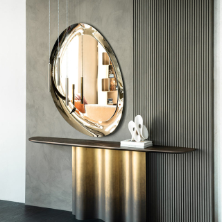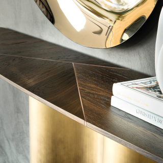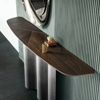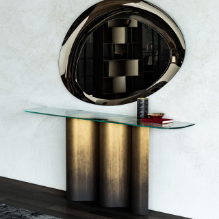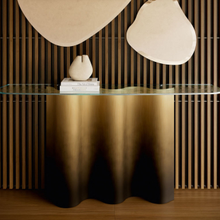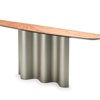 Консоль Nettuno - это плавные формы и изгибы. Металлическое основание напоминает морские волны и в зависимости от ракурса оно обыгрывается игрой света и тени. Основание доступно в четырех цветовых вариантах: Бронза, Титаниум, Оксид Латунь, Серый Оксид. Столешница может быть выполнена в прозрачном стекле, декоративном стекле, а так же в дереве Орех Каналетто или Жженый Дуб. Деревянная версия имеет изысканное сочетание сбалансированных стыков. Для заказа представлены различные размерные варианты. Так же данная консоль имеет два размера по высоте: стандартный 74 см и высокий вариант 92 см.