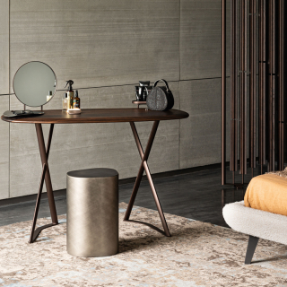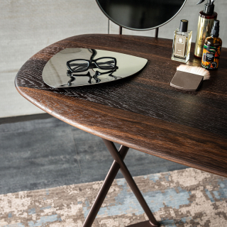 TAHITI TROUSSE - небольшой туалетный столик из новой коллекции Cattelan Italia 2025 года. Основание и рама зеркала металл в бронзовом цвете или цвете титан. Округлая столешница доступна в отделке из Ореха Каналетто или Жженого Дуба.