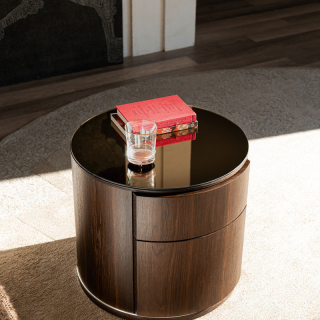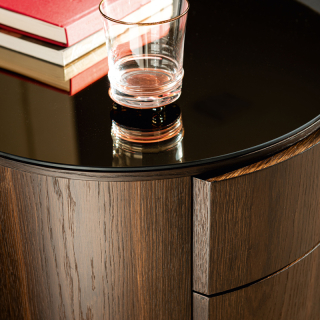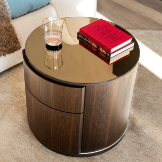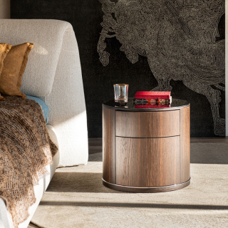 LIDO прикроватная тумба из новой коллекции Cattelan Italia. Тумба имеет цилиндрическую форму и оснащена двумя выдвижными ящиками. Столешница выполнена из бронзового зеркала, что придаёт спальне успокаивающее и гостеприимное очарование. Основание из хромированной стали. Тумба доступна в отделке Орех или Жженый Дуб.