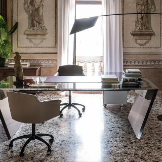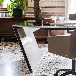 VEGA - роскошный рабочий стол для кабинета, который можно оборудовать дополнительными предметами, превращающими модель в функциональную офисную систему. Стол VEGA - это отличный вариант для стола руководителя, сдержанный, элегантный, изготовленный из высококачественных материалов, стол станет украшением кабинета. Конструкция стола изготовлена из дерева, а внутренняя поверхность окрашена в матовый графит. По вашему желанию столешница может быть дополнена практичной накладкой из натуральной сверхпрочной кожи. VEGA можно оснастить второй рабочей поверхностью, которая будет размещена L-образно, чуть ниже основной столешницы. Дополнительная поверхность размещается на тумбе с выдвижными ящиками, которая имеет колесики. Два практичных выдвижных ящика тумбы имеют фасады с обивкой из кожи.