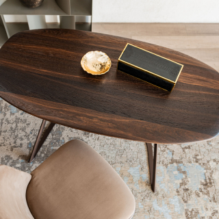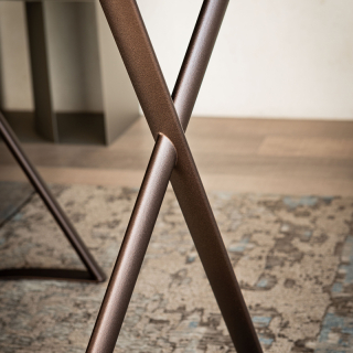 TAHITI - небольшой письменный стол из новой коллекции Cattelan Italia 2025 года. Основание металл в бронзовом цвете или цвете титан. Округлая столешница доступна в отделке из Ореха Каналетто или Жженого Дуба.