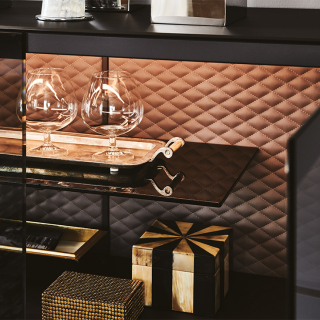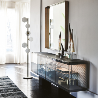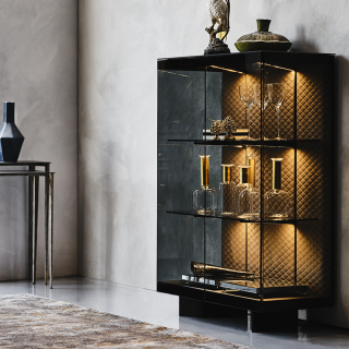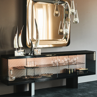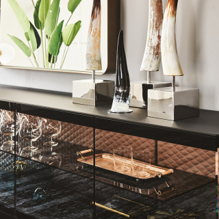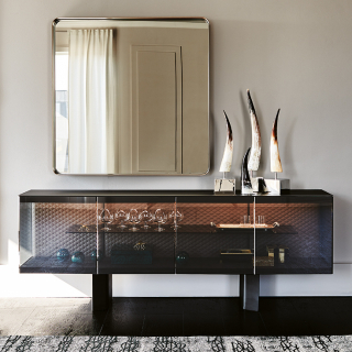 BOUTIQUE - роскошная коллекция мебели, состоящая из серванта и витрины. Дизайн модели: Alberto Danese. Производство: Италия. Фабрика: Cattelan Italia. Изделия состоят из дымчатого стекла и задней стенки, обитой кожей с декоративной стежкой в виде ромбов. Ножки изготавливаются из металла. Сервант и витрина оборудованы подсветкой. На выбор 3 размерных варианта: сервант на низких ножках, сервант на высоких ножках и витрина.