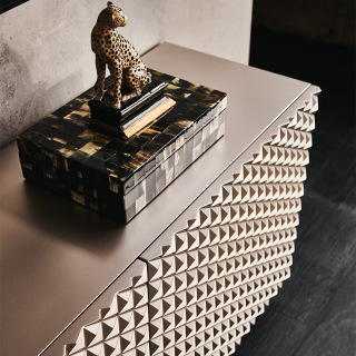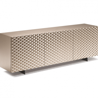 ROYALTON - сервант гипнотизирующий своим дизайном. Дверцы серванта выполнены из трехмерных объемов, образующих геометрический узор. Благодаря этому декору дверцы приобретают завораживающий эффект с игрой света и тени. Сервант доступен в двух-дверном исполнении или в трех-дверном.