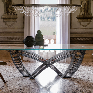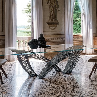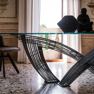Гармоничное сочетание практичности и изысканности - это стол HYSTRIX. Дизайн стола разработан Giorgio Cattelan. Основание выполнено из металлических прутьев, которые пересекаются между собой и создают очень необычную форму. Дополнительным контрастом к металлическому основанию служит столешница из прозрачного стекла. HYSTRIX - настоящее произведение искусства и скульптурное изделие, которое способно украсить интерьер столовой зоны в современном стиле. Для заказа доступно 4 размерных варианта.