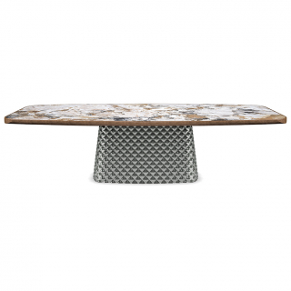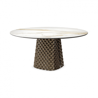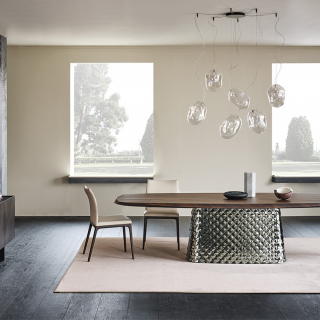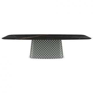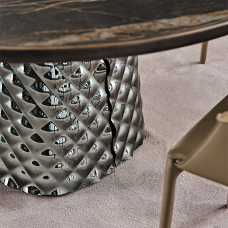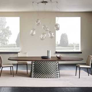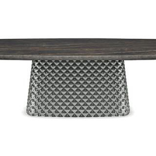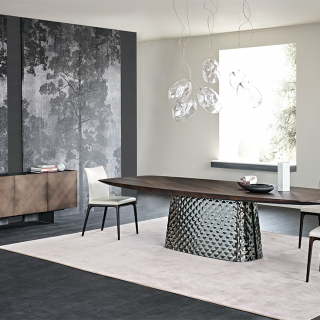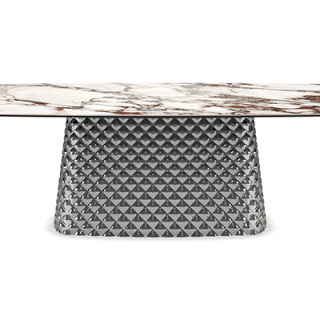 Новинка современного каталога итальянской фабрики Cattelan Italia - обеденный стол ATRIUM. Модель имеет оригинальное основание из двух рельефных и тонко обработанных пластин зеркального стекла. Основание стола создает приятную игру света и тени. Рельефное стекло выполнено при помощи новейшей технологии, которая придает поверхности трехмерный эффект, подобный стёжке ткани. Стол ATRIUM доступен со столешницей из керамики и массива дерева. Модель представлена в различных размерных вариантах.
