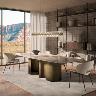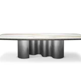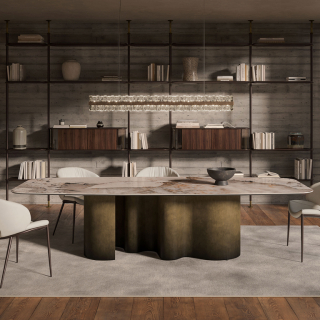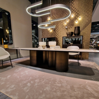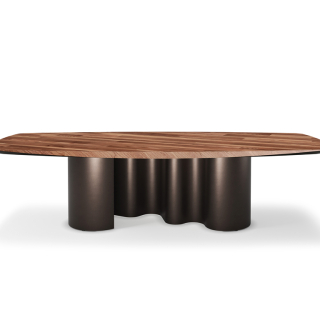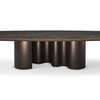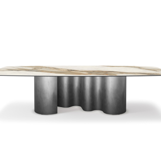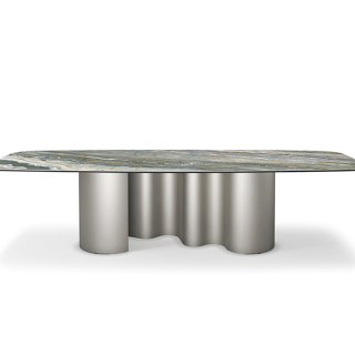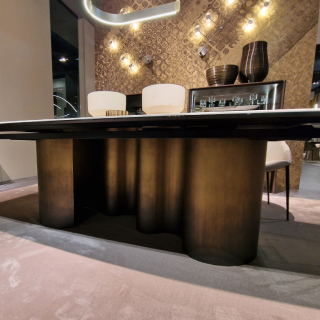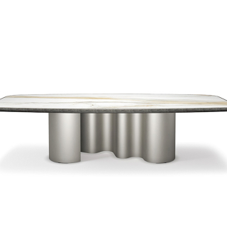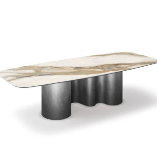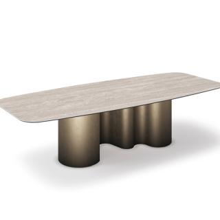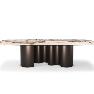 Обеденный стол PAPEL. Новая коллекция 2024 года. Стол имеет оригинальное основание из гнутого металла и по форме напоминает морскую волну. Основание доступно в четырех различных цветах: Titanio, Bronzo, OXYBRASS и OXYGREY. Столешница может быть разных форм: прямоугольная, прямоугольная со скругленными углами, овальная, сложной формы. Для изготовления столешницы доступны различные материалы: стекло, обесцвеченное стекло, керамика, натуральный шпон дерева и массив дерева.