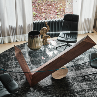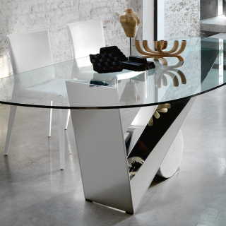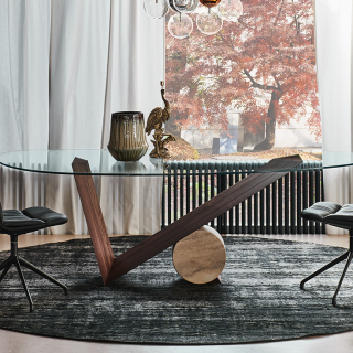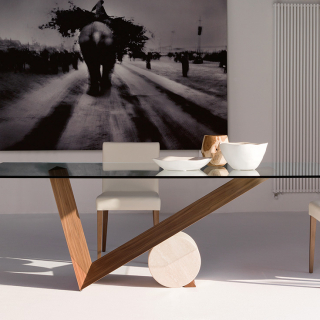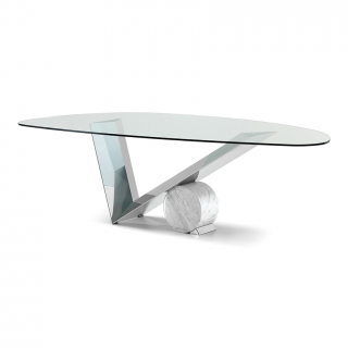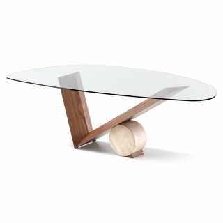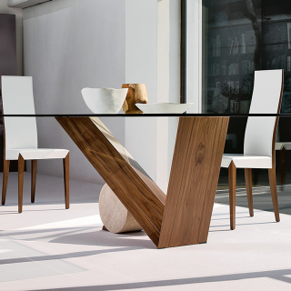 Легендарная модель VALENTINO обеденного стола Cattelan Italia, разработанная еще в 1991 году Emanuele Zenere. Необычное основание сочетает в себе объемы, которые уравновешены правильной геометрией. V-образная ножка из массива дерева поддерживается мраморным цилиндром. Столешница изготавливается из прозрачного закаленного стекла.