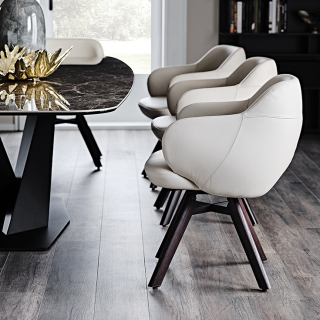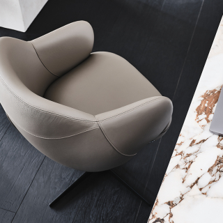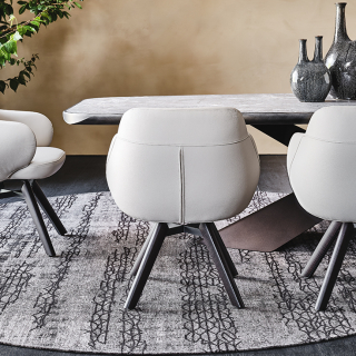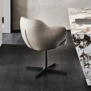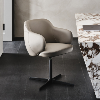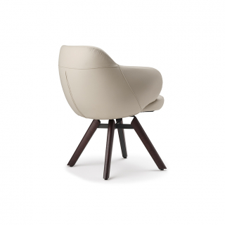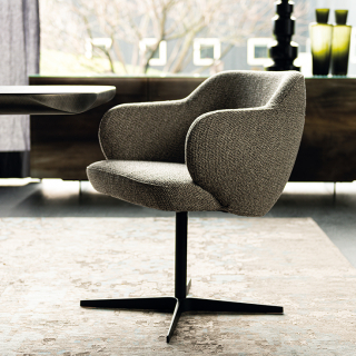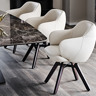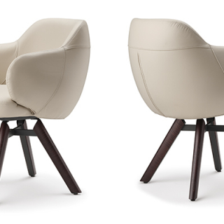 Вращающийся стул BOMBÈ с обволакивающим, полукруглым сидением. Модель имеет два варианта ножек: 4 ноги из дерева или 1 нога из лакированной стали. Вашему выбору доступно множество обивочных материалов: натуральная кожа, ткань или искусственная кожа. Дизайнер модели: Paolo Cattelan.