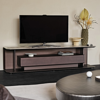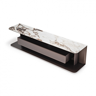 AWARD - стильная дизайнерская ТВ тумба, которая не имеет фасадов, за исключением одного центрального большого выдвижного ящика. Тумбу украшает изысканная керамическая столешница. AWARD отличается изогнутыми передними краями, наклонным профилем и узкими боковыми панелями.