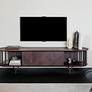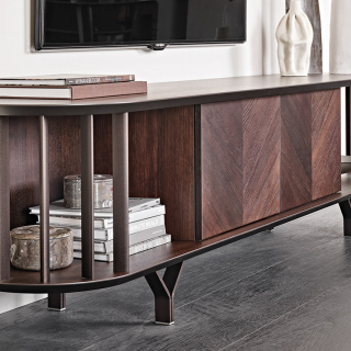 COSTES - телевизионная тумба из новой коллекции 2022 года от итальянской мебельной фабрики Cattelan Italia. Тумба имеет красивые металлические ножки и потрясающие дверцы, выполненные из деревянных диагональных планок. Внутренние полки из дымчатого стекла. Для заказа доступно два варианта, отличающихся высотой ножек.