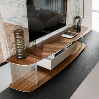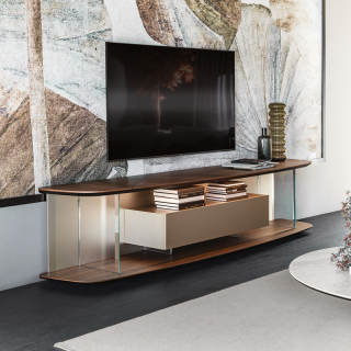 ALTAVISTA - ТВ тумба из новой коллекции Cattelan Italia. Благодаря свои пропорциям и искусному балансу отделочных материалов модель смотрится очень легко и изящно. Три материала, казалось бы, не связанные друг с другом, идеально сочетаются в данном изделии. Столешница и основание из дерева, прозрачные стеклянные боковины и элегантная металлическая отделка выдвижного ящика и ниши. Сочетание эстетики и функциональности. Тумба оборудована удобной кабельной розеткой и идеально подходит для размещения электронных устройств. Для заказа доступны две отделки: Орех Каналетто и Титаниум или Жженый Дуб и Бронза и два размерных варианта.